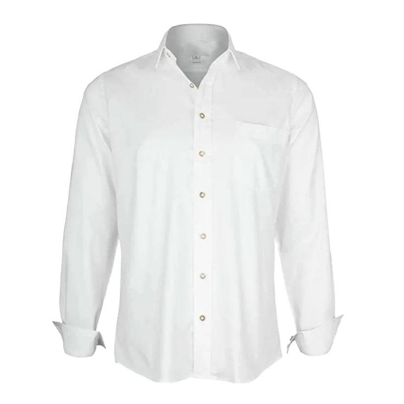 Weißes Hemd mit blau/karo Kragen und Armel-Umschlag mit Horn-Imitat-Knöpfe.