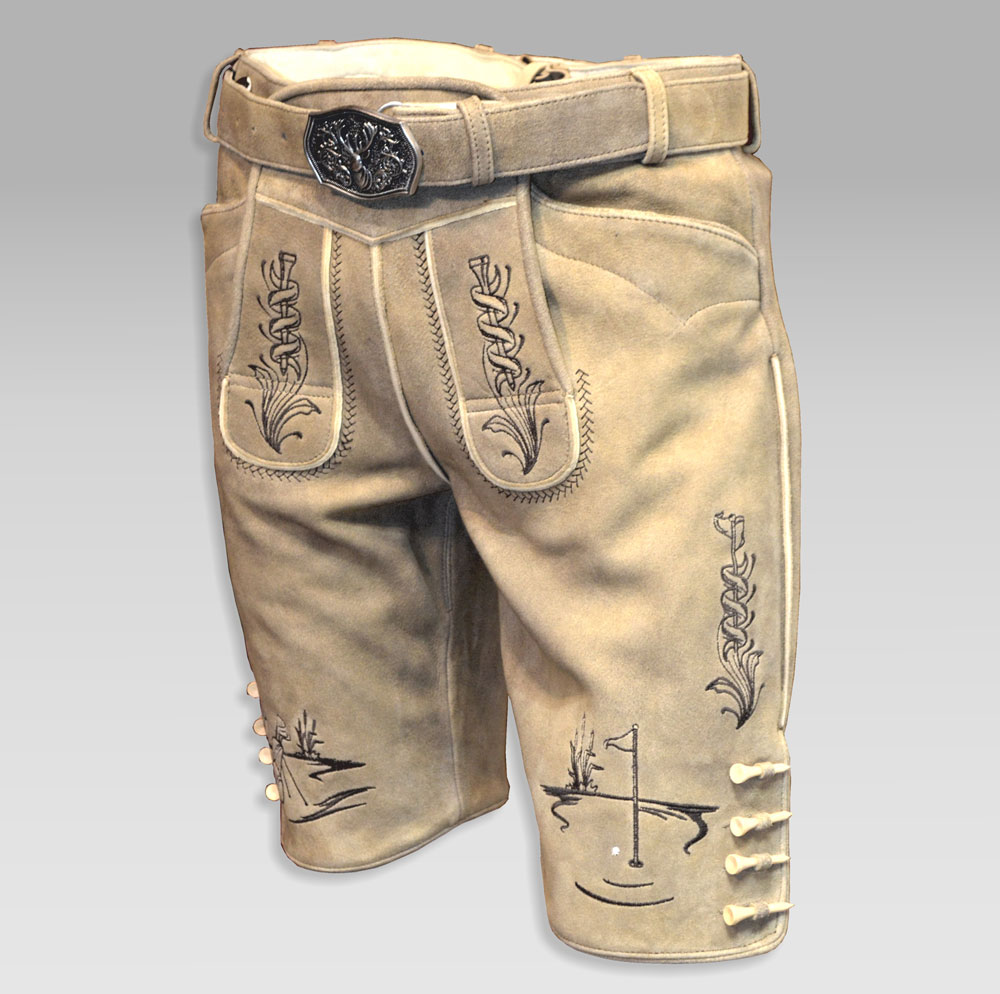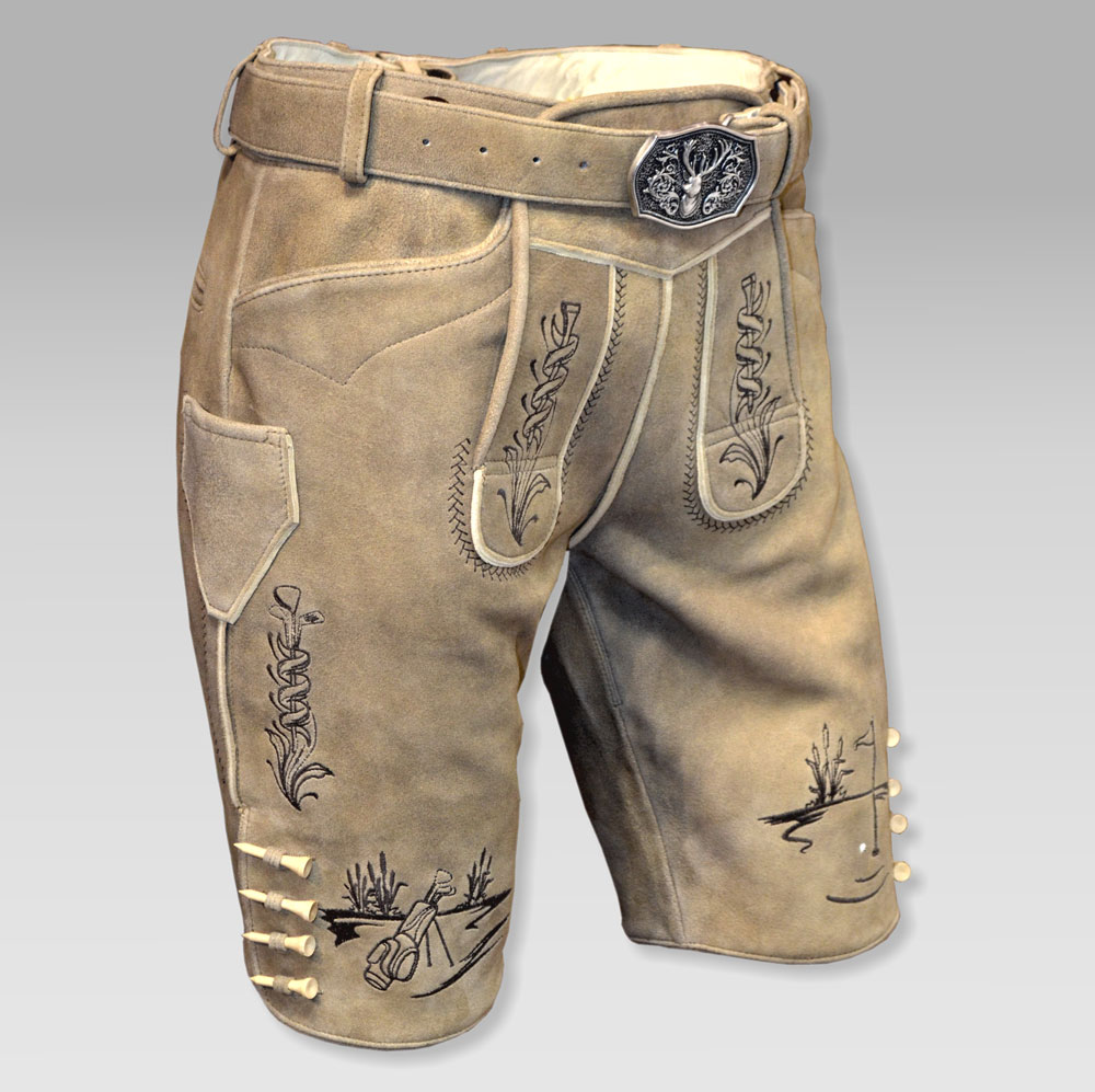 Lederhose ist mit Golf-Motiven Ton in Ton braun bestickt.